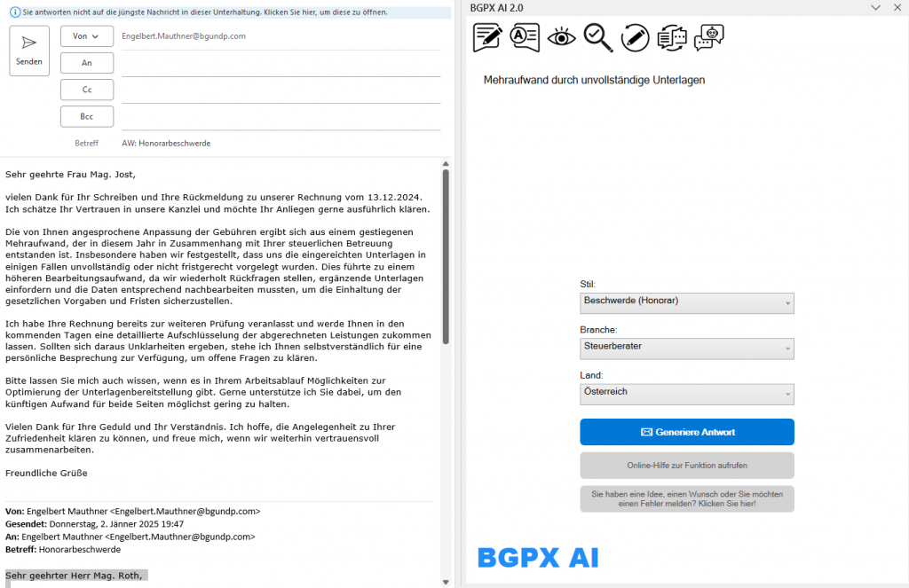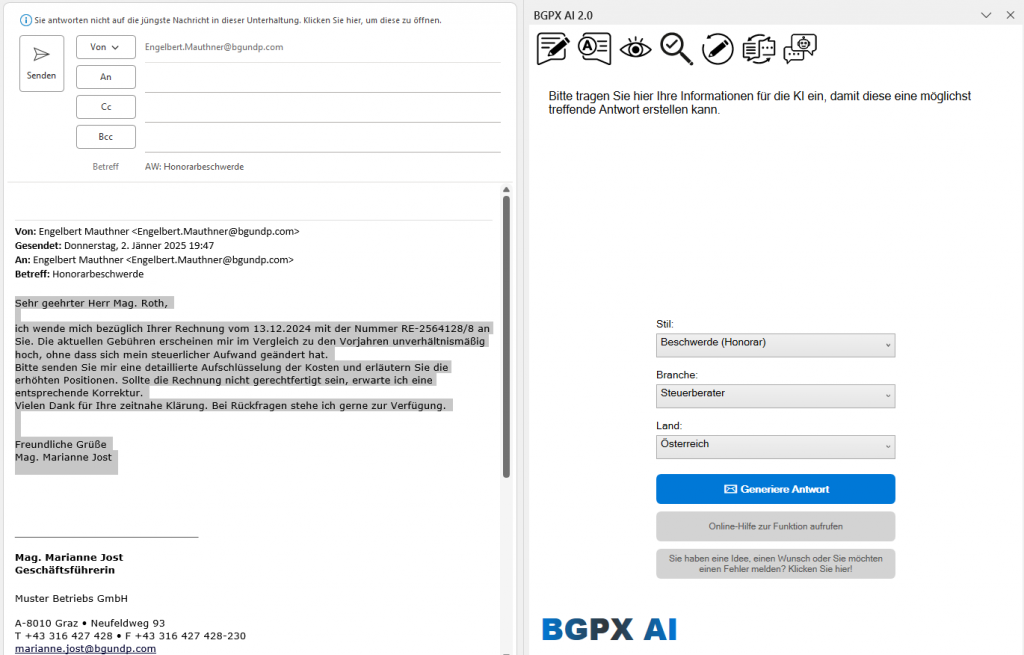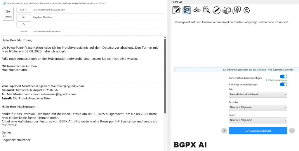 Mit einem Klick auf „Antwort generieren“ erstellt BGPX AI innerhalb weniger Sekunden den passenden Textvorschlag. Die E-Mail ist sofort versandbereit oder kann bei Bedarf noch individuell angepasst werden.