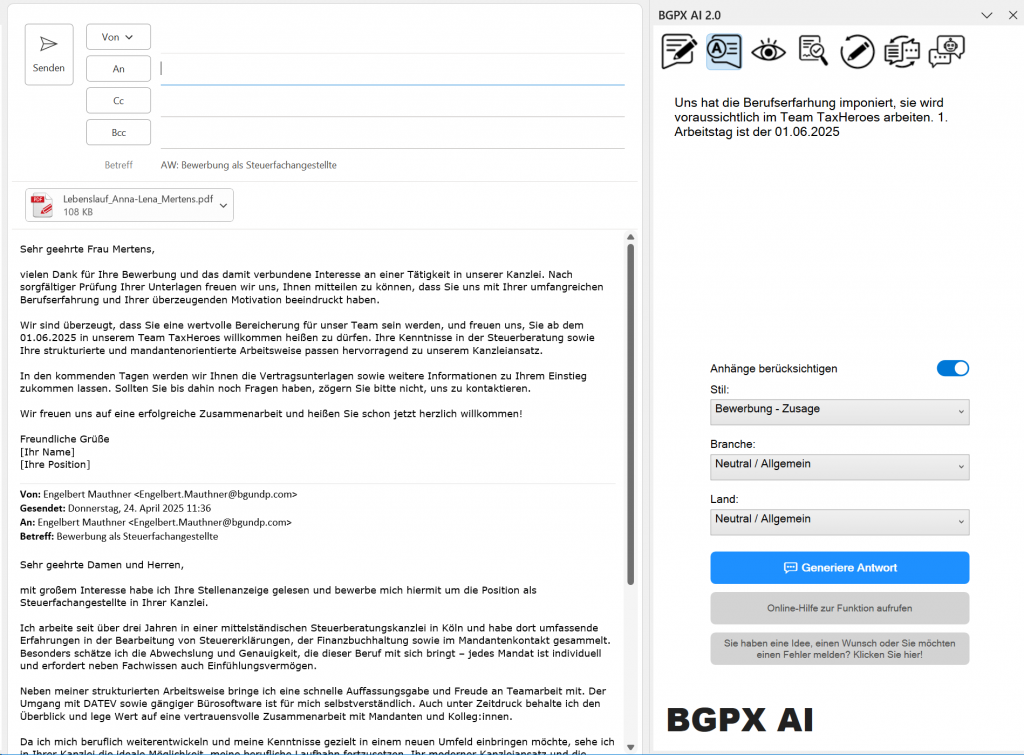Wenn die Funktion „Anhänge berücksichtigen“ aktiviert ist, werden relevante Informationen aus angehängten Dateien automatisch in die Antwort eingebunden. Das spart Zeit und sorgt für inhaltlich präzise und kontextbezogene Antworten – zum Beispiel bei Bewerbungen, Beschwerdebehandlungen oder Projektanfragen.