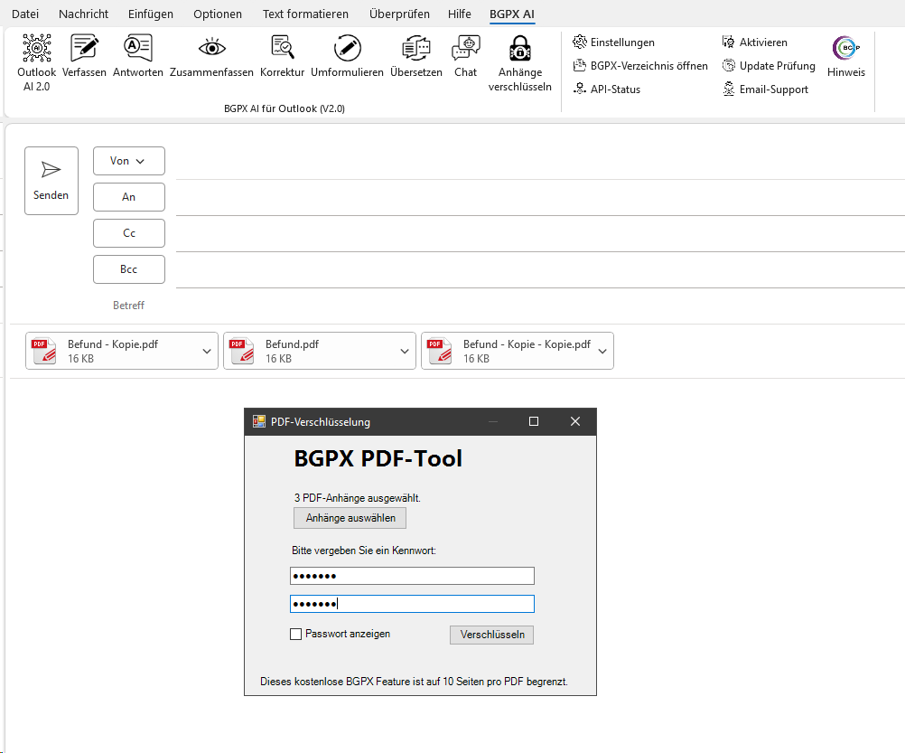 Vertrauliche Unterlagen per E-Mail zu versenden, erfordert besondere Sorgfalt. BGPX AI für Outlook bietet Ihnen eine integrierte Verschlüsselungsfunktion für PDF-Dateien – unkompliziert, sicher und kostenlos für Anhänge mit bis zu 10 Seiten.