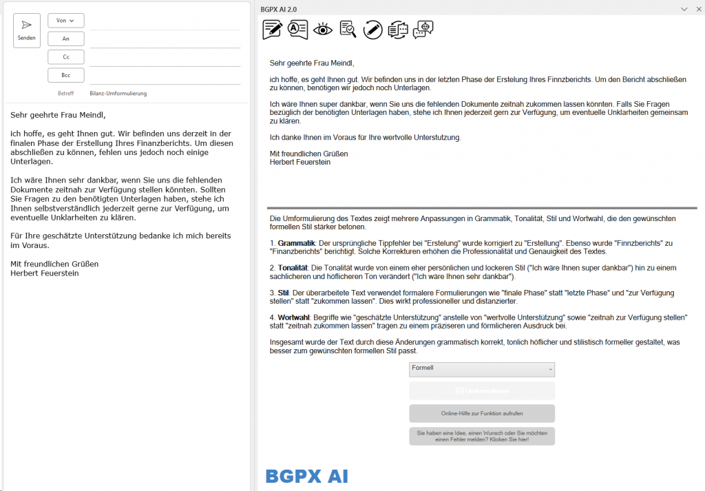 Sie markieren den Text, wählen einen Stil aus der Liste, und BGPX AI überarbeitet die Formulierung automatisch. Der Originaltext bleibt in einem separaten Fenster sichtbar. Zusätzlich erhalten Sie eine kurze Analyse der vorgenommenen Änderungen.