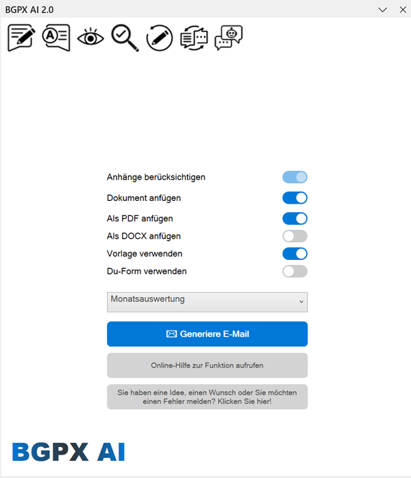 Mit BGPX AI erstellen Sie E-Mails direkt in Microsoft Outlook. Einfach, schnell und datenschutzkonform. Die Bedienung ist intuitiv. Sie geben nur wenige Stichwörter ein – das Tool formuliert daraus professionell strukturierte Nachrichten. Prompt-Kenntnisse sind nicht erforderlich.