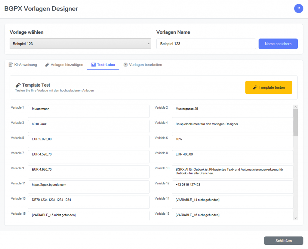 Man kann es sich wie einen Lückentext vorstellen – BGPX AI befüllt diesen mit den richtigen Werten aus den Beilagen. Auf Wunsch wird ein Begleitschreiben generiert, im PDF- oder DOCX-Format. Die Zeitersparnis ist enorm!